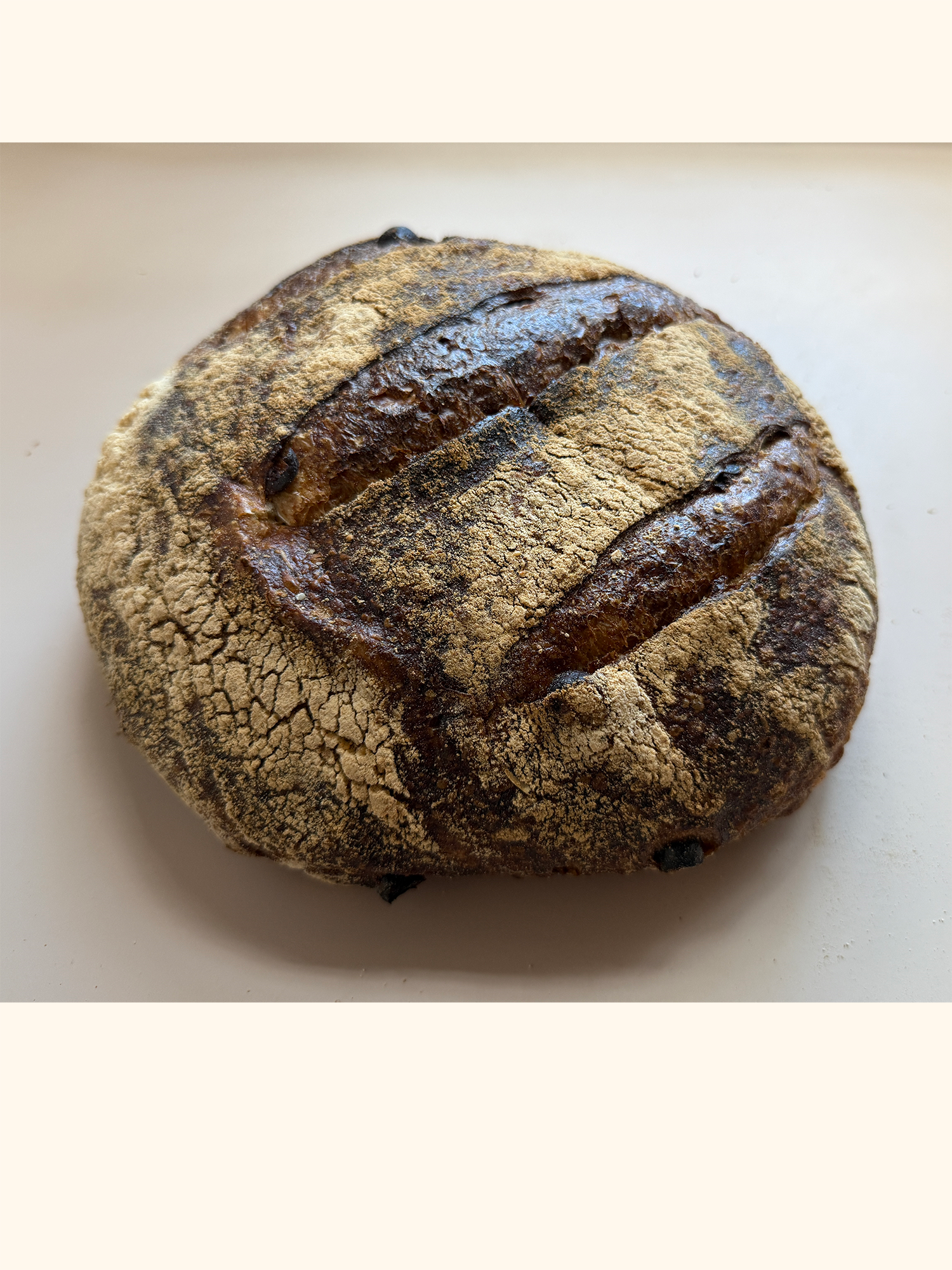 White sourdough boule with added Kalamata olives baked until deeply caramelised for a chewy crust and open, savoury crumb spiked with briny olives.